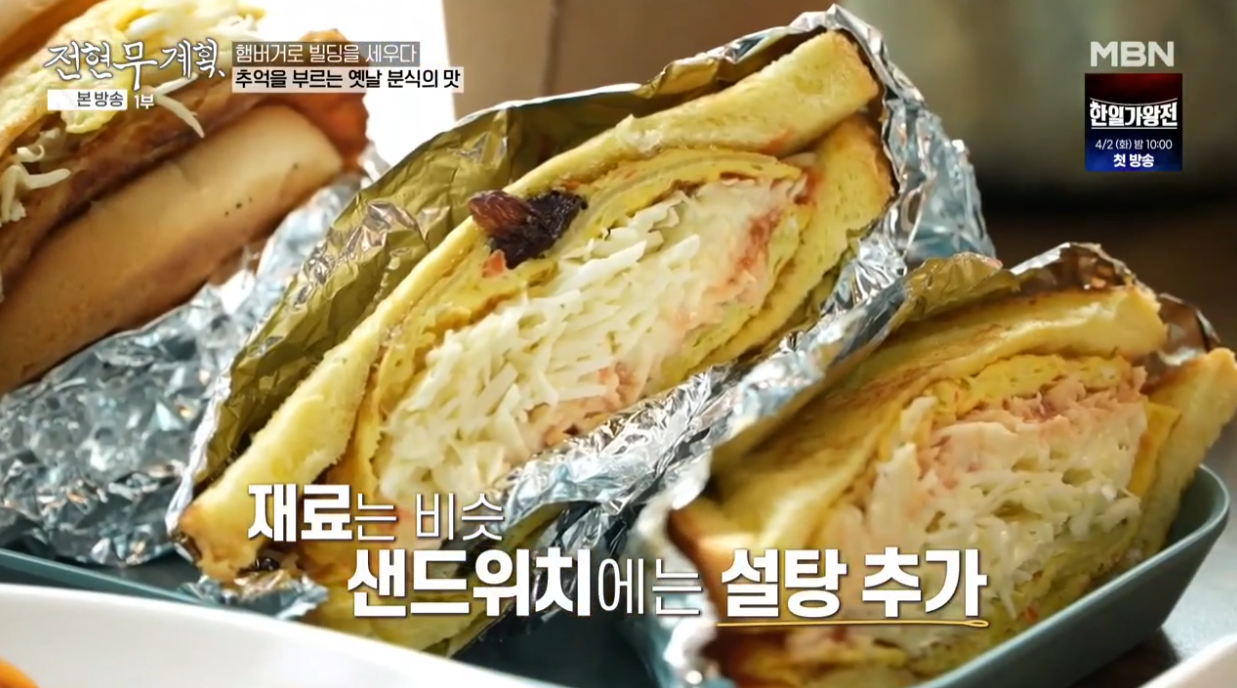 햄버거🍔는 겉면만 살짝 익힌 햄버거빵 위에 소고기&야채 반죽의 패티를 구워서 올리고 그 위에 햄, 옛날식 양배추 샐러드, 오이, 달걀부침을 올려서 만듭니다. 빵을 마가린으로 구워서 더 고소하다고 하네요.